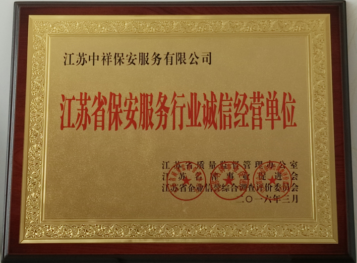 江蘇中祥保安公司榮獲江蘇省保安服務(wù)行業(yè)誠(chéng)信經(jīng)營(yíng)單位